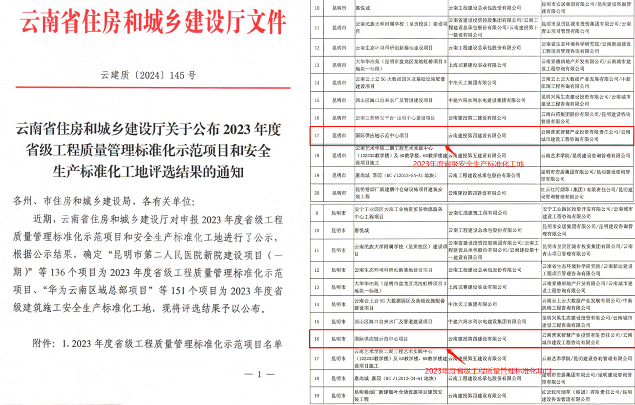 近日,云南省住房和城鄉建設廳公布了2023年度省級工程質量管理標準化項目和安全生產標準化工地評選結果,昆明經投集團旗下云南營家智慧產業投資有限責任公司(以下簡稱“營家產投公司”)負責建設的國際供應鏈示范中心項目(以下簡稱“項目”)被評為2023年度省級工程質量管理標準化示范項目和安全生產標準化工地。